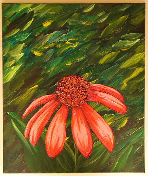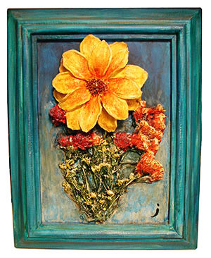 The floral piece either a rather flat sculpture or an extremely textured painting. It has real dried flowers dipped in gesso and stuck to the hardboard with acrylic, and finally painted in acrylic.
