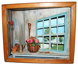 The shadow boxes, about 3 inches deep, are one step further toward sculpture. The large one is a mix of materials in the gesso coated sculpture which is then painted in acrylic. The smaller one allows some unpainted or slightly highlighted miniatures as part of the scene.