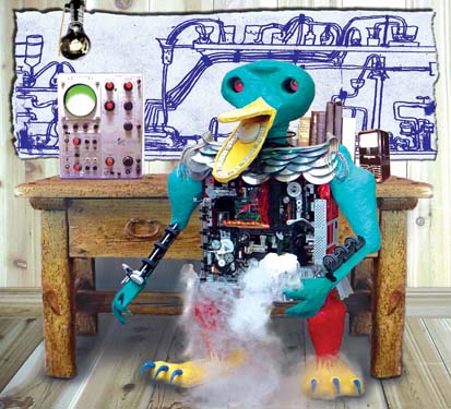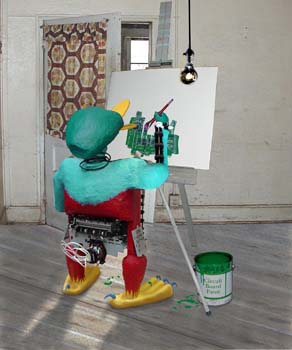 Clay and paint are not the only mediums I have fun with when it comes to art. My computer with Photoshop software is another source of creative fun. The objects in these pictures are real, but the scenes were created entirely on the computer, right down to the fake shadow in the scene with Zap painting a picture.