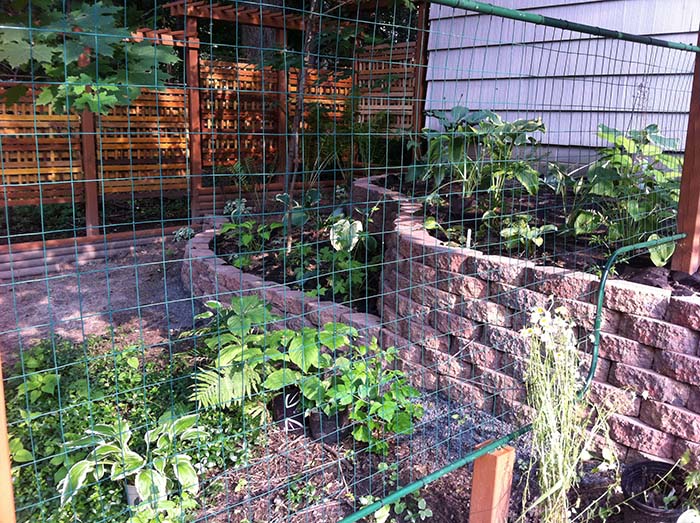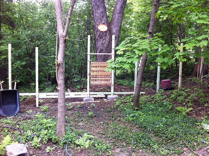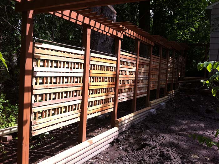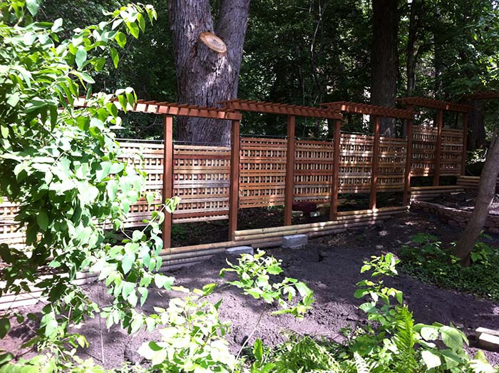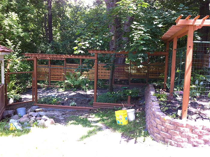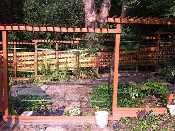 The purpose of the posts was to support a small pergola that would run around the perimeter of the garden, and also hold the trellis panels on the back side. Besides wanting something attractive, we wanted to keep the deer out of this garden. We knew that deer readily jump a 6-foot fence, the maximum fence height allowed by code. But I speculated that a pergola would give the deer a lot more to think about before trying to leap over. The trellis panels would deter them from walking through, and the pergola would deter them from trying to jump over.