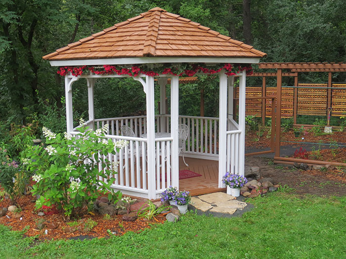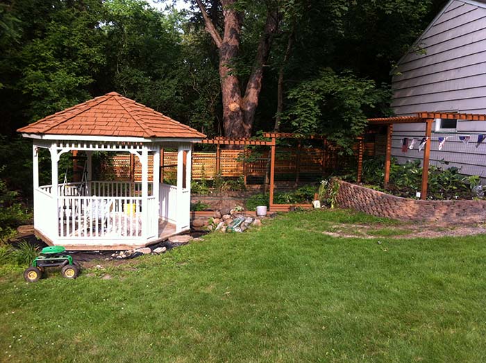 Many people asked, "Did you put a new roof on the gazebo?" No, Joy only stained it, but it looks brand new! So does the rest of the gazebo for that matter. The hostas and a number of other plants have been planted. The garden is mostly done. All that remains on the gazebo is screen and new door. The area in front of the terrace is about to become a rain garden.