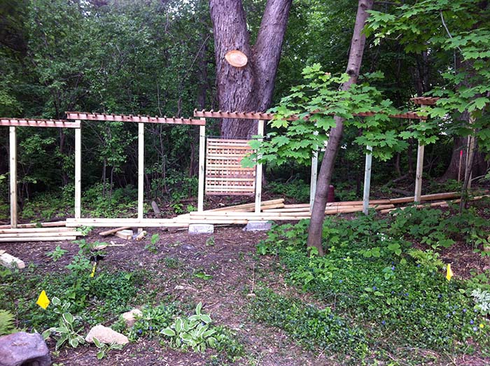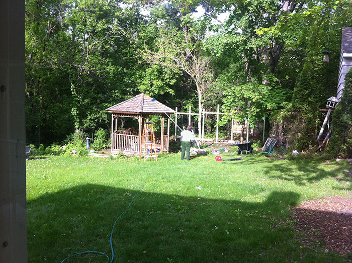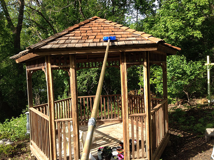 One of the first things you might notice here is that we cleared all that Buckthorn away. The old ripped screen is gone off the gazebo, and Joy is just getting started on staining the roof. About half the 4x4 posts are up.