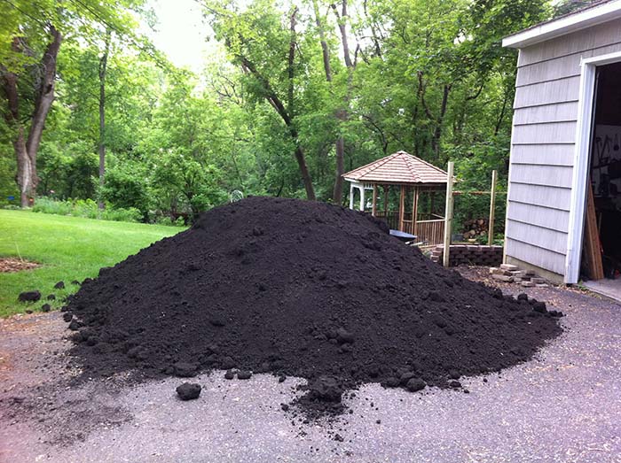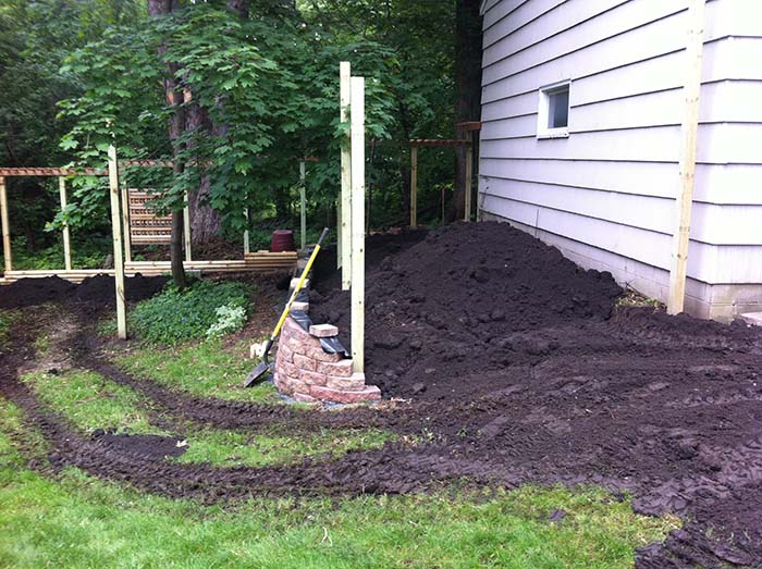 The 10 feet or so closest to the garage was a steep embankment that would not be good planting space. So I decided to terrace that area and fill it with dirt. The railroad garden did not have a monopoly on the dump truck action.