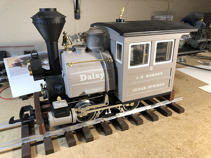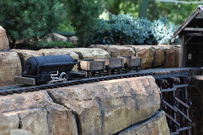 I stole wheels off some O-gauge cars to come up with wheels small enough to be typical of ore cars that would be seen with a compressed air loco. I 3D printed frames for the ore cars. The original plan was that the mine tunnel track was a straight shot, so the fixed couplers on the cars need to get replaced before this little train becomes functional. The fixed couplers don't make it around the curve. But once I fix that, the motor block in the compressed air loco is functional, and the track it sits on is wired for track power. There are also sensors in the track to tell the controller where the locomotive is. Once controller programming is complete, this little ore hauler will automatically go back and forth between the mine and the loading tower. Or at least that's the plan.