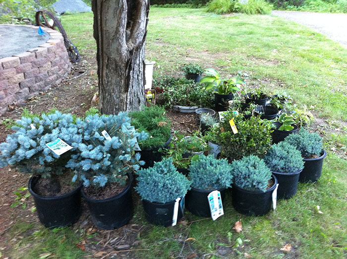 It was late in the season by the time I got the gardens ready for planting. That turned out to be convenient - everything in the garden center was on sale. I purchased several small junipers and pines, nothing that would be more than 5 feet high or wide full grown. If I start with something that doesn't want to get huge in the first place, then the pseudo-bonsai job will be much easier. The plants on the mountain tops are predominantly pine themed to give the logging train an appropriate backdrop.