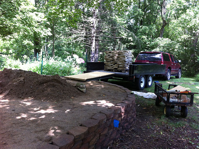 I had only a rough idea of a plan here. Once I saw what size garden I could get out of one pallet of flagstone, I realized I still had too much fill left over. I ultimately dug a lot of that out since this doesn't make for good plant growing soil. I piled the excess fill in my "dirt inventory" area, which has the compactable sand/clay fill, black garden dirt, gray trap, and coarse limestone each in their own pile.