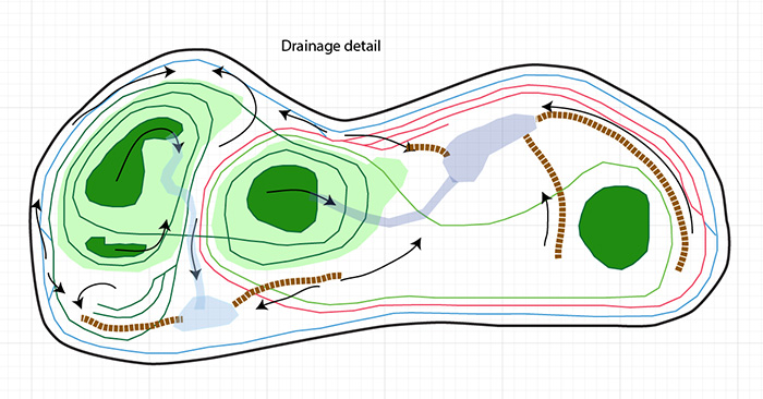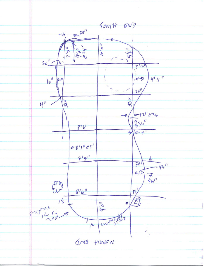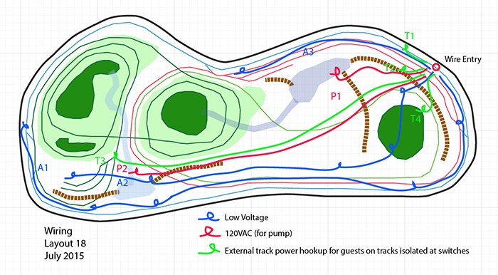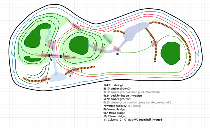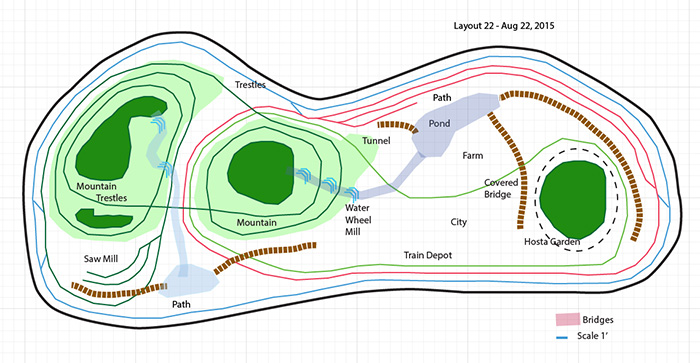 The darker green loop going around the mountains will be the logging train. It will loop around up the mountain on the left, cross a long high bridge on the front side (bottom of drawing) to the mountain on the right, loop around back down and cross a lower bridge on the back side.