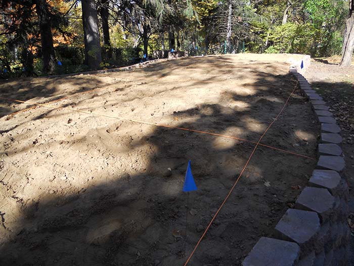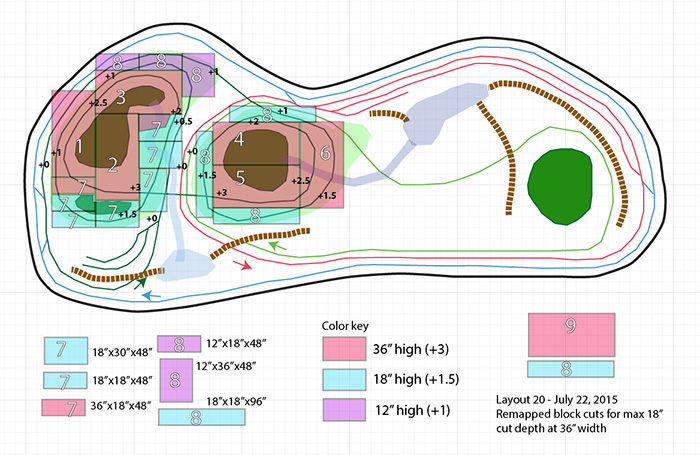 The various "+" numbers on the tracks are elevations measured in feet above base grade. A big part of the rough calculating at this stage of the game was keeping the grade at 5% or less, and adjusting the block cutting "recipe" accordingly.